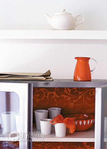 用鮮亮圖案的材質(zhì)或墻紙來重新裝飾櫥柜,這是一個(gè)簡單易行的制造沖擊力的方法。用當(dāng)代風(fēng)格的墻紙、壁布,甚至是印刷品都可以,將它們貼在櫥柜里面、柜門上或者干脆就貼在外面。但最好和整個(gè)空間的風(fēng)格和色調(diào)相協(xié)調(diào)。