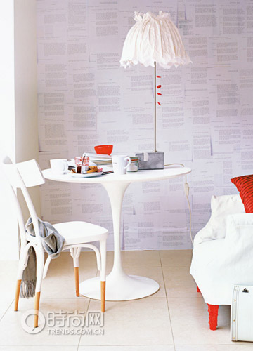 用復(fù)印的文稿裝飾個(gè)性墻面。將墻面涂滿膠水,然后粘上文稿。不要過于擔(dān)心是否整齊,不規(guī)則更增添其吸引力,其他的小工藝還包括用彩紙包裹椅子腿,或者在粉刷家具時(shí),故意留下一部分,以及將臺燈的拉繩點(diǎn)綴上紐扣,而選擇紅色靠包可能是最簡單易行的調(diào)色方法了。