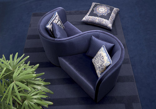 小沙發(fā)Face To Face,藍(lán)色絲絨面料,兩個相連的座位營造和諧浪漫的氣氛。