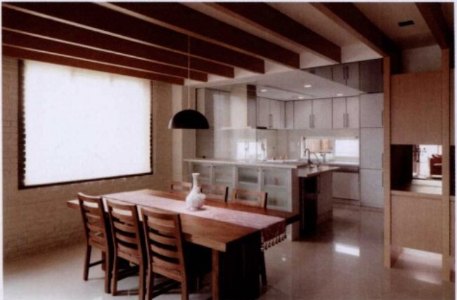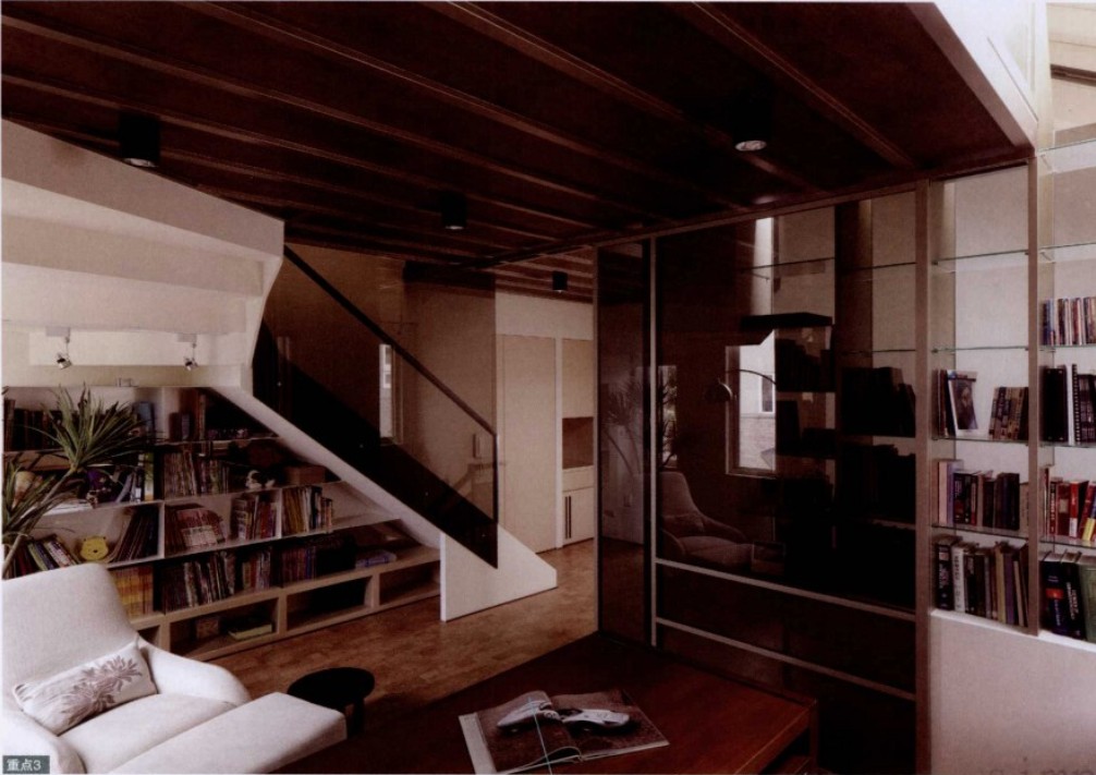設計師運用開放式空間規(guī)劃,減少木作的使用,以突出挑高、無壓的空間優(yōu)勢,并使用環(huán)何涂料及原木地板等環(huán)保建材,不只在于健康空間的營造,也讓受閱讀的屋主所收藏的書籍有適當的收納空間。保留斜屋頂,將挑高的區(qū)域規(guī)劃為閣樓,充分采光的天窗及玻璃扶手隔屏連接書房,滿足了收費也營造了良好的閱讀氛圍。