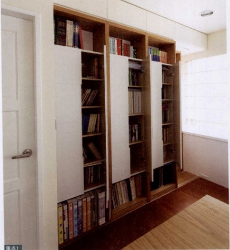 一開始,是想把書房也做在臥室里,這個房間作為父母來小住的空間。但是書實在太多了,對于愛書的男主人來說,書籍的收納絕對需要解決的問題。僅僅單面的書柜都是無法滿足需求,于是設(shè)計師便 設(shè)計了雙層書柜,除了外層柜的門片外,柜體同時也是移動的門片。