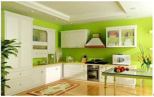 綠色 :輕松舒爽,賞心悅目是綠色給人的第一印象。綠色深淺變化使人心曠神怡,從淡綠轉(zhuǎn)化為灰綠,然后暗綠,室外與室內(nèi)的色彩逐漸過度,淡綠如田野的地板,黃色如秋葉的柜體,墨綠如松針的臺面,構(gòu)成一幅自然景色,使人心情豁然開朗。淡綠與淡藍的配合,能讓廚房充滿盎然生機。
