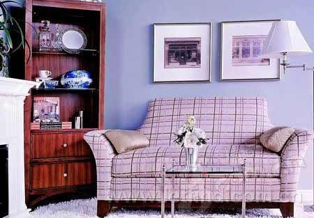 灰藍(lán)墻面打底的基調(diào)上,歐式白色裝飾壁爐是古典家居的標(biāo)準(zhǔn)配置。多層扶手的土色格紋沙發(fā)突出都市人青睞的舒適和簡潔,金屬框架雙層玻璃的可移動式小幾方便碼放雜志和零食,在視覺上也通透無比。角柜的設(shè)計半中半西,擺放的西洋酒具和青瓷盛器也糅合了兩種風(fēng)格。