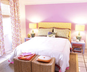 用亮麗耀眼的色彩粉刷一面墻壁,是打造家居看點(diǎn)最快、最有效的方法。紫紅色甜美而溫馨,但如果刷滿四面墻,就顯得太過瘋狂和病態(tài)了。在這個(gè)案例中,一面墻適當(dāng)?shù)厥褂昧俗狭_蘭色,與黃色床頭板形成對(duì)比,突出了床這一“主角”。