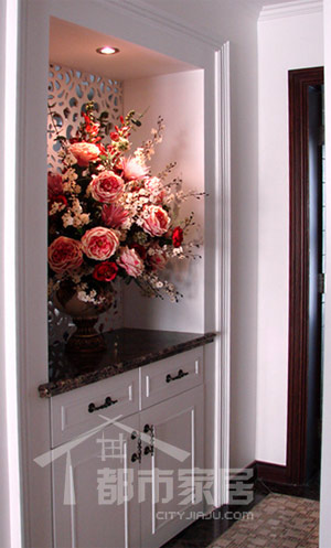 新增的玄關,上半部分是花形鏤空木板,下半部分是超實用的鞋柜。結構簡單的玄關里擺上一捧**的鮮花,再打上柔媚的燈光,小小的角落里瞬時繽紛起來。