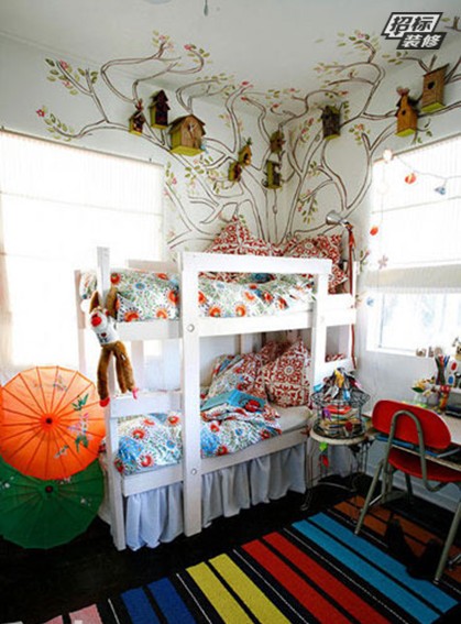 一看就知道家里有兩個(gè)可愛的小公主,上下床的設(shè)計(jì)將她們放在一起,一起分享關(guān)于成長(zhǎng)的日記。房間色調(diào)干凈明亮,鮮艷的色彩脫穎而出,吸引大家的視線。美麗的手繪背景墻面則是大亮點(diǎn),從角落延伸出去的枝干和綠葉花蕾的點(diǎn)綴,以及不同位置的各異鳥籠,讓白色的墻壁變的鳥語花香,具有很強(qiáng)的童趣設(shè)計(jì)。