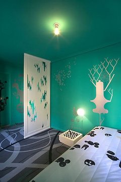 于零五年四月開幕的HotelFox,位于丹麥?zhǔn)锥几绫竟?,它的出現(xiàn)震撼了酒店及涂鴉藝術(shù)界。該酒店邀請(qǐng)了全球十三個(gè)國(guó)家,共二十一位著名涂鴉藝術(shù)家、插畫設(shè)計(jì)師,把原本三星級(jí)的舊酒店改頭換面,六十一個(gè)房間配以六十一種不同的裝飾設(shè)計(jì),不再是獨(dú)沽一味,充滿年輕活潑感覺。