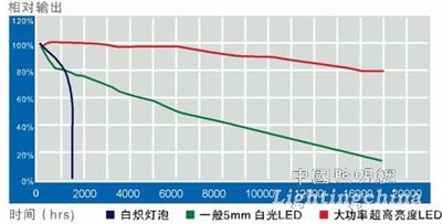現(xiàn)在有的商家,為了降低成本,就采用幾百只φ5的小功率LED。然而這種小功率的LED的光衰是非常嚴(yán)重的,按照其光衰至80%的壽命只有1000小時(shí)。所以,作為需要長期使用的路燈是絕對(duì)不能允許采用這種小功率LED的。作為大功率LED,其光衰就要好很多。然而國內(nèi)不少廠家也還是只能做到10000小時(shí)下降10%。遠(yuǎn)遠(yuǎn)不能滿足使用要求。