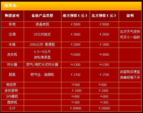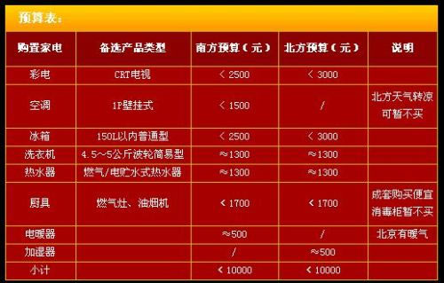 用一萬元購置成套家電,如果全部選擇大品牌,還真有難度,所以在做預(yù)算時(shí)對于哪些家電要做長期投入哪些選擇過渡產(chǎn)品一定要清楚。同時(shí)針對目前生活需求,