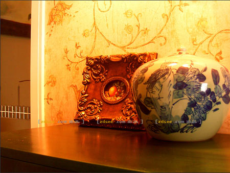 餐柜旁的空地是一塊休閑區(qū)域,擺放了吉他和一些收藏品。墻上的花朵妖嬈纏繞,餐柜的放置賦予沉穩(wěn)的氣質(zhì),墻上的壁畫用來巧妙地遮擋配電箱,羚羊角展現(xiàn)了神圣的味道。