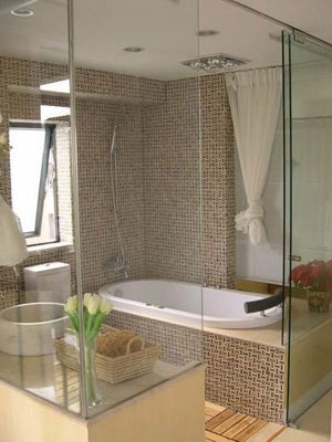 這種浴室緊鄰主臥室,二者之間只用一塊磨砂甚至透明玻璃隔開,使衛(wèi)浴空間出現(xiàn)全透明的效果。由于沒有墻的阻擋,主人可以看到房間的每個(gè)角落,浴室中水汽繚繞,里面人影在珠簾下若隱若現(xiàn),這種神秘感使透明浴室的魅力更大了,不僅豐富了主臥室的魅力,使空間更通透,在視覺上起到擴(kuò)大空間的作用,而且使兩個(gè)不同的功能空間融成為一個(gè)整體,讓整個(gè)家居更具現(xiàn)代氣息。身處此空間,人很容易產(chǎn)生許多聯(lián)想與期待。