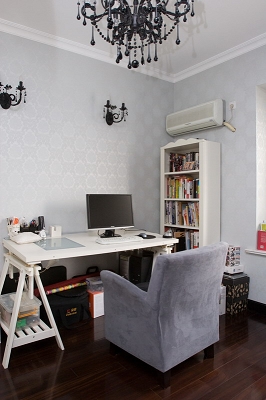 而書房又是另一種腔調(diào),白色基礎(chǔ)上的Art Deco風(fēng)格。門是隱蔽在客廳電視柜后的背景墻內(nèi)的,左側(cè)一邊推開來(lái),先看到兩塊半透空的簾子,自天花板至地板垂直懸掛,不同的花紋,同樣薄而輕飄的質(zhì)地,做了視線上的一個(gè)小小阻隔。轉(zhuǎn)入屋內(nèi),右手邊一張裝飾風(fēng)格的邊柜,白色油漆底下還能看見木材的紋理;左手邊靠墻一張書桌,造型凹得很別致;書桌右側(cè)靠窗是一個(gè)白色書架,同樣帶一點(diǎn)裝飾風(fēng)格;書桌左側(cè)一面墻全部做成了衣柜,與邊柜同樣風(fēng)格,作為這間屋子的收束。與風(fēng)格變化相應(yīng)的是,這間屋子里的色彩也柔化了一點(diǎn):黑色被換成了灰色,包括一個(gè)單人沙發(fā)、一幅窗簾。窗簾是帶閃的桑蠶絲質(zhì)地,底下一個(gè)飄窗,鋪白色墊子,林琳說(shuō)這個(gè)房間“好看,但就派不出太多用場(chǎng)“。其實(shí)這跟書是同一個(gè)道理:讀書能直接派上什么用場(chǎng)呢?可是整個(gè)兒的讀書氛圍本身就是有意味的。