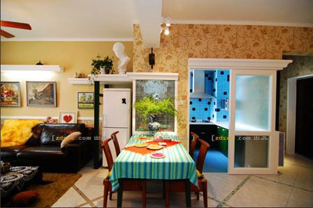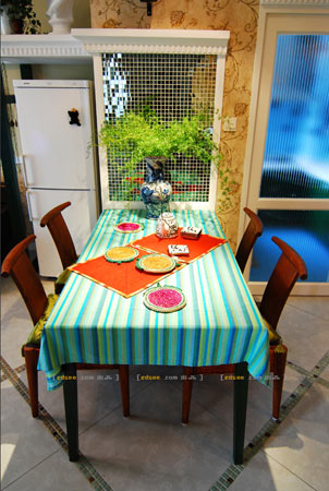 廚房門口便是餐廳,鋪上綠色條紋桌布,再配上藤藤制餐椅和花瓶,營造了清爽舒適的環(huán)境。墻壁鋪貼了鏡子馬賽克,人在家中的活動都能在鏡中顯現(xiàn),使居室有動感和生機。