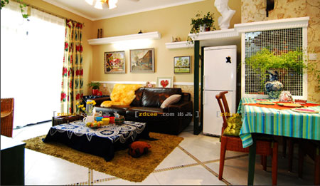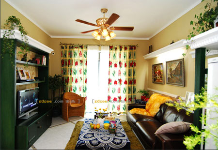 客廳中設(shè)計了幾段眉檐,它們并沒有連綿不斷,而是錯落有致的斷開,制造了一種殘垣斷壁的意境。沙發(fā)旁的冰箱上方設(shè)計成涼亭狀,恰似戶外花園的景致。墨綠色的家具,有點復(fù)古,有點張揚,又有點刁巧,仿佛讓人感覺回到了原野上??蛷d的吊扇燈,復(fù)古的精致雕花,展現(xiàn)優(yōu)雅、細膩的風(fēng)情。