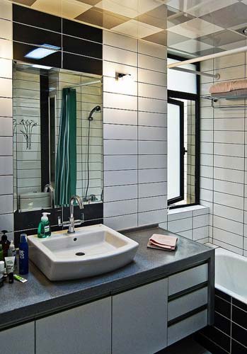 與淋浴間相對(duì)的墻面完全使用了鏡子,擴(kuò)大了小浴室的空間視覺感,鏡子前面做成了浴室架,上面安裝了臺(tái)式盆,這里可以梳洗打扮,邊上的綠色植物,成了整體設(shè)計(jì)中引人注目的亮點(diǎn),也為環(huán)境帶來(lái)了生氣。