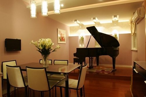 進(jìn)門后的走道,左側(cè)隔斷是半透空的,視線所及首先注意到的是一架三角鋼琴。這本是一個封閉的房間,現(xiàn)在被開放出來,外面半間做了餐廳,里頭半邊地板墊高了一層,擺放鋼琴,做成一個舞臺的樣子。背后那一面墻,底下用淡紫色的涂料,上頭貼米色簡約花紋的壁紙,中間等分處嵌三個細(xì)細(xì)長長的玻璃壁龕,各攏著一束繡球花——也是淡紫色的。再配上幾盞射燈的光影效果,從走廊這一頭看過去,便當(dāng)真是一個小小的、美麗的舞臺布景。而從鋼琴這一側(cè)望過去,則正面對著兩扇白色窗框、配花枝圖案簾子的窗戶,又是另一角舞臺布景。