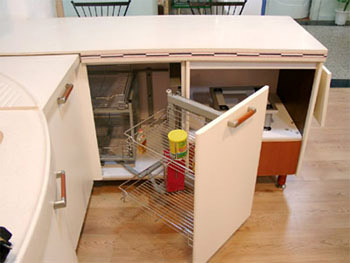 水槽下方的柜體空間很大,但空膛的利用率往往不高,因?yàn)橛泄艿?,不便于放擱板,要想有序地碼放東西,就要利用這種凹型抽屜拉籃,凹型口避讓了管道,寬大的抽屜讓取物更方便。
