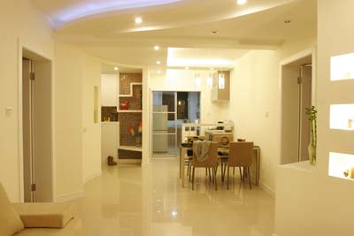 經(jīng)過大手筆空間改造的居室,就好像在一幅空白藍圖上重新進行了規(guī)劃,既對空間進行了改造,更能夠?qū)崿F(xiàn)一些帶有創(chuàng)意性質(zhì)的設(shè)計。李云家的客廳與餐廳便是如此。她最初的構(gòu)想是,既然拆除了一道墻,就是想要一種非常通透的感覺,而且希望這個空間既有必要的功能劃分,同時還能呈現(xiàn)出一種整體感。于是設(shè)計師為她繪出了一張包含著雙弧線的圖樣:以客廳電視機背景墻那一面為一個大的半圓弧,連接起餐廳與之相對的一面墻上一個小的半圓弧。圓弧的構(gòu)型既表現(xiàn)在吊頂上,同時也延伸到整面的墻體。