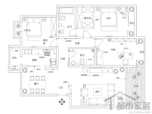 這是改造完成的平面布置圖,能夠看到各功能區(qū)域劃分非常明確。三居室的空間對于一對新婚夫婦來說是足夠用了,考慮到男主人喜歡看書的特點,設(shè)計師建議業(yè)主減少一間臥室,將次臥中的一間改為書房,這樣合理的建議立即得到了業(yè)主的認同。