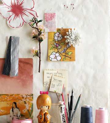 剪一朵櫻花和幾幅圖片,與新鮮的花枝和涂鴉的畫一起釘在墻上,新鮮的創(chuàng)意折射出靈氣,日式瓷娃娃和兩個(gè)線圈非常討巧,甜美可愛中透著細(xì)膩和質(zhì)樸。
