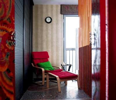 從臥室望向客廳,紅與綠的色彩象兩重美麗的畫框,鎖住了一道家的風景。