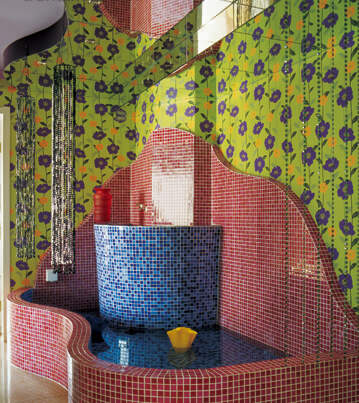 大廳的墻是紅色,很扎眼,但家具是白色的,窗簾是黑色的,這幾種顏色搭配起來特別鮮明。樓道吉米選擇綠配紫,屬于對撞的顏色里最沖突的,吉米說只有這樣才會把主題包括主人的個(gè)性充分表達(dá)出來,非暖即冷,反正不會選擇中庸。