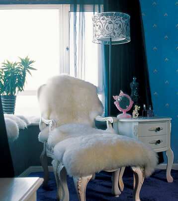 臥室吉米特別強(qiáng)調(diào)了色彩在功能性上所起的作用,因?yàn)榕P室如果用紅和綠會比較亢奮,不能馬上進(jìn)入睡眠狀態(tài)。于是,吉米選擇了深色,吊燈有點(diǎn)發(fā)紫,地毯也是紫藍(lán)的顏色,窗簾又是黑色。到家累了,一拉窗簾,完全就是休息的氛圍。但是床上用品和家具,吉米選擇了白色,這樣就不會那么悶。