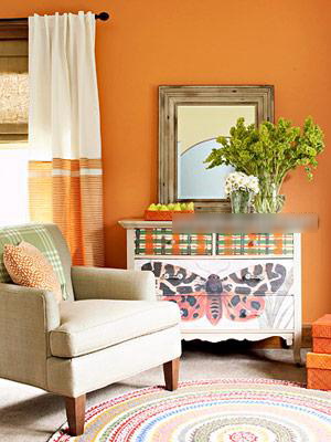 1、華麗以乳白色為主色,用之于墻面、天花板,地面用稍深的桔灰色,門窗采用接近的同類色,家具可采用鑲嵌有圖案的亮褐色,地毯、坐墊、飾品中點(diǎn)綴一些紅、桔紅、深紅、翠綠褐色。