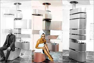 這個(gè)集成式衛(wèi)浴被形象地稱作為'脊椎',它將馬桶、水槽、浴缸和兩個(gè)淋浴器整合在一起,形成了一個(gè)8英尺(約2.4米)高的柱體。除了分別為大人和兒童準(zhǔn)備的兩個(gè)淋浴器只能旋轉(zhuǎn)180度以外,其余部分均可以旋轉(zhuǎn)360度。整個(gè)裝置的中軸是一根鐵柱,里面囊括了所有的管道系統(tǒng)。當(dāng)你需要使用哪個(gè)部分的時(shí)候,只需將它輕輕推出來即可,非常適合小戶型。