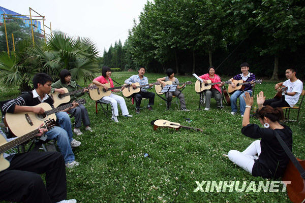 北川中學的“輪椅樂隊”正在校園草坪上排練(2009年5月4日攝)。北川中學有個“輪椅樂隊”很出名,成員是10個因地震致殘截肢的學生。2008年11月溫總理訪問北川中學時,他們曾為總理演奏。