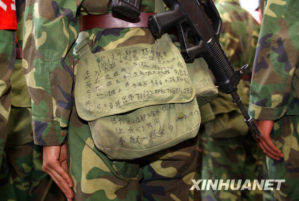 一名戰(zhàn)士的軍挎包上記錄了抗震救災的誓言與信念(2008年7月22日攝)。當日,參與地震重災區(qū)彭州抗震救災的1000余名***官兵在成都火車站登車撤離,數(shù)千名遭受地震創(chuàng)傷、感受子弟兵關(guān)愛的災區(qū)群眾趕往車站送別。新華社發(fā)