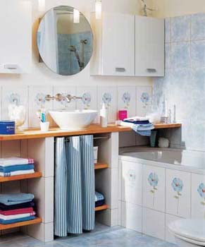 在浴缸周圍的墻壁上打一個(gè)七八厘米深的凹洞,再鋪上與墻壁相同的瓷磚,此洞可用來放洗浴用品等東西。這樣既擴(kuò)大了使用空間,使用起來也方便、自如,衛(wèi)生間看上去也更井然有序。