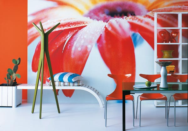 以曲線和色彩裝點房間各個角落。左起,內(nèi)層為鋅質(zhì)缸盆的花盆架(cm45×45×43高,215歐元),與弧形的Adamo長凳相連(cm178×38×45高,390歐元,整體設(shè)計以白色上漆的野生松木為材質(zhì),Pircher出品),條紋靠墊(Linum出品,約25.40 歐元/個)。HI!綠色白樺木掛衣架,顏色還有紫紅色、櫻桃色和黑色(Pascal Tarabay設(shè)計,Diamantini&Domeniconi出品,cm55×55×172高,300歐元起價)。同樣為綠色的水晶桌面,黑色涂層的鋼制結(jié)構(gòu),桌子的尺寸和顏色都可以選擇,同樣也可以根據(jù)需要加長長度(這里的尺寸:cm140×80×76高,966歐元)。紅色Delfy椅子,外殼為光亮的工程塑料材質(zhì)(Gino Carollo設(shè)計,Ciacci Kreaty出品,有各種顏色選擇,144 歐元/把)。桌面上,白色陶瓷的 Zurbaran水果盤(Studio Sigla設(shè)計,Terre Blu出品),細頸陶瓷瓶和小籃子(Sardegna Lab出品)。后面,用Wall to Wall組合模式制作的漆木書架(Poliform出品,這里的尺寸:cm105×32×197高)。架子上,兩個Dalu'燈的新版造型(Vico Magistretti 1965年設(shè)計,Artemide出品,59歐元/個),陶瓷花瓶(Luca Scacchetti設(shè)計,Terre Blu出品,140歐元)。采用Gerbera面料的巨幅墻布裝飾(Jannelli&Volpi出品,Magic Walls系列,共8塊裝飾布,整體尺寸cm372×270, 405.60歐元)