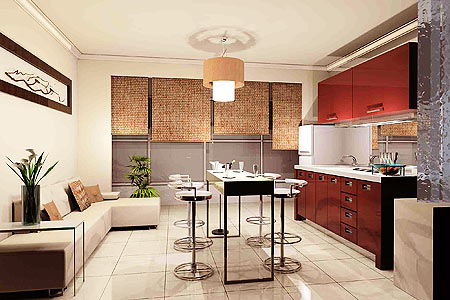廚房的墻面必須以實用為主,但新型材料的出現(xiàn)為其裝飾功能奠定了基礎。在能解決油煙的前提下,你可以嘗試使用涂料和墻紙,它們色彩艷麗,花紋豐富,一改廚房墻壁單調(diào)的局面。這時選擇的涂料墻紙要有很好的耐擦洗性和多層覆蓋性。在水池和灶臺附近,可以用玻璃、金屬等合成材料制作的隔油層釘在墻上。