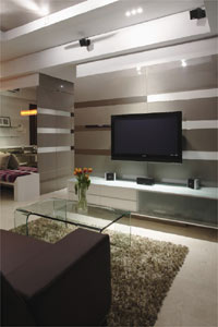 鐘真萍說(shuō),在室內(nèi)設(shè)計(jì)中,選用橫條紋的造型或配飾也是增大視覺空間的方法,橫條形鏡面通過(guò)反射使到視覺空間得到延伸。以紫褐色為主色調(diào)的主臥室,同樣為了在視覺上有擴(kuò)大感,在墻上用了橫條紋裝飾。