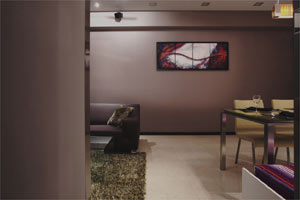 設(shè)計(jì)師為公寓客廳選擇線條簡(jiǎn)潔的紫褐色沙發(fā),透明的玻璃茶幾。飯廳里特別定做的長(zhǎng)凳子,配搭上艷麗的紫紅色坐墊,叫飯廳亮麗起來(lái)。