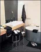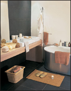 黑色酷而時(shí)髦,是經(jīng)典的風(fēng)格。用黑色給都市男人定性是約定俗成的。所以為他們打造的浴室也自然是黑色的。從洗漱套件到地毯、熏香燈都一絲不差地選用黑色,連男士專用的香水沐浴露都是用黑色來包裝的。如果覺得色彩太單一的話,可以用白色、灰色來調(diào)劑一下,就算是一枝簡(jiǎn)單的馬蹄蓮也可以起到特別的效果。