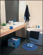 天空、海洋的蔚藍(lán)色可以讓人感到心情舒爽,很適合在炎熱的季節(jié)里表現(xiàn)出來。藍(lán)色系東西挑選余地很大,因?yàn)橘|(zhì)地的不同而折射出深淺不一的色彩。玻璃、塑料等透明的家居用品最適合設(shè)計(jì)成藍(lán)色,在燈光的照射下十分漂亮。藍(lán)色基調(diào)的浴室能讓你的疲憊在沐浴中流逝,和天一色,和海一色,真是件愜意的事情。