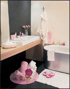 既然黑色給了office里的帥哥,那粉紅就很自然地留給女人。嬌艷的色彩讓人見了就心生愛意。粉紅蕾絲的紙巾盒、化妝包,綴著花朵的拖鞋把女人的柔媚之情表露無疑。在這樣的浴室里所有的裝飾品都被染上了這種顏色,玫瑰、香精當(dāng)然是不能少了。這個(gè)城市的性格太冷硬,在浴室里還是讓女人還原一下吧!