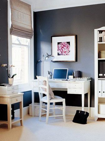 墻面藍灰黑色層次感十足,相框中的紅花與整體色調(diào)形成強烈反差,值得玩味。白色抽屜,椅子,,臺燈頗具質感,椅上擱有條紋布藝靠墊。右側為宜家(查看地圖)書架。抽屜左后方白色小桌上居然又是兩層抽屜的白色小柜,上面隨意擺放一盆小花,給整個房間更添幾分詩情畫意。