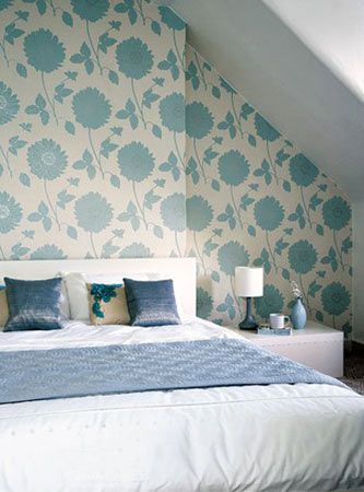 白底淺藍色向日葵圖案的墻紙賞心悅目。床架和儲藏格均來自宜家,被子和床罩自然也是清新的淡藍色。床頭藍色小靠墊和藍花小靠墊隨意擺放,窗邊小桌上,藍色底座白色燈罩的臺燈與花瓶繼續(xù)將藍色進行到底,藍色成為整個房間的主宰,既淡雅又充滿情趣。