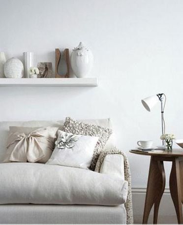 純白色墻漆奠定室內(nèi)主色調(diào),純白沙發(fā)上隨意堆砌數(shù)個白色布藝靠墊,或編織而成、或以雛菊、蝴蝶結等裝飾,美觀大方。純木小桌給白色世界加上了難得的一筆自然色。臺燈、咖啡杯、水杯、碗、花等一律白色。沙發(fā)背后墻面架子上,瓷花花瓶、木質花瓶、折疊花瓶等將空間裝點得越發(fā)生動。