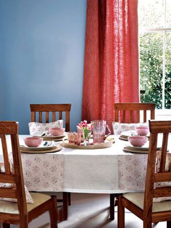 淡藍灰色墻面配以淺紅色窗簾,長條餐桌上鋪以純白桌布,與布藝的木質餐椅自然搭配,均來自。椅上白底粉花的小靠墊與同樣白底粉花的桌旗、餐巾相互輝映。宜家白瓷質主菜盤、小盤,以及淡粉色的小碗、淺紅色玻璃杯等無不流露出素雅的回歸。