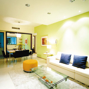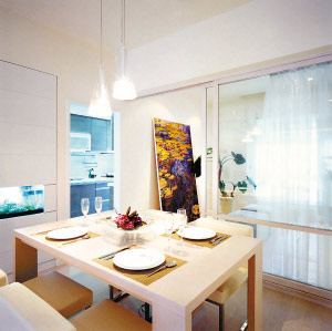 淺色系可以提升空間感,所以小戶型的整體裝修色調(diào)應(yīng)該是淺色的,包括墻面和家私,如米色、白色、粉綠色等,這些色彩具有擴(kuò)散性和后退性,能使房間給人寬敞明亮的感覺(jué)。小戶型的裝修要簡(jiǎn)單,因此墻面的色彩不要太多,可以通過(guò)裝飾來(lái)展示主人的品味。墻面可以用景深大的圖畫(huà)來(lái)做裝飾,這種圖畫(huà)也可以起到提升空間感的效果。如果是大幅墻面裝飾可以選用電腦大型輸出圖,因?yàn)樗鼉r(jià)格低廉,大面積使用時(shí)比較劃算。而且它的材質(zhì)是布面的,臟了用濕布擦擦就可以,容易清潔。電腦輸出圖是貼在墻上的,也很方便替換,當(dāng)你過(guò)一段時(shí)間想改變家居風(fēng)格時(shí),可以很容易改變。線條也可以營(yíng)造在視覺(jué)上延伸空間的效果,房間比較矮可以用豎紋的墻紙?jiān)黾涌臻g的高度感;房間比較窄則可以用橫紋的墻紙延伸房間的縱深感;選用條紋圖案的地板也有同樣效果。