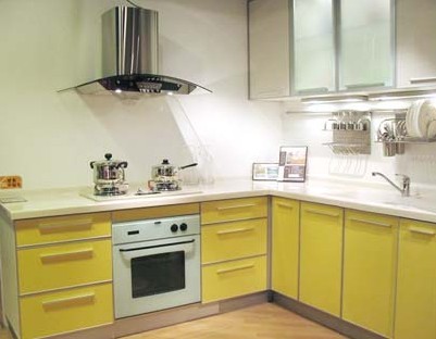 由于家具的色彩往往會左右環(huán)境的色彩,因此,對廚房家具色彩的要求是能夠表現(xiàn)出干凈、刺激食欲和能夠使人愉悅。通常能夠表現(xiàn)出干凈特點(diǎn)的主要有灰度較小、明度較高的色彩如白、乳白、淡黃等,而能夠刺激食欲的色彩主要是與好吃的食品較接近、或在日常生活中能夠強(qiáng)烈刺激食欲的色彩,如橙紅、橙黃、棕褐等。能夠使人愉悅的色彩就復(fù)雜多了,不同的人,不同的生活環(huán)境對色彩的喜好有很大的變化。下面我們就推薦幾款不同色彩的櫥柜。