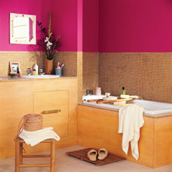 這個(gè)衛(wèi)浴間有著現(xiàn)代和傳統(tǒng)兩種元素的痕跡,浴缸和面盆都是十分普通的,所用的馬賽克和地磚種類也都是物美價(jià)廉的裝修材料。但它們卻用了大膽的相互結(jié)合的手法,墻的上半部采用十分強(qiáng)烈的紅顏色,浴缸和面盆都用木貼面裝飾,并以馬賽克做鑲邊,飾品和輔助的家具運(yùn)用傳統(tǒng)的樣式和材料,一間非凡味道的衛(wèi)浴間就形成了。