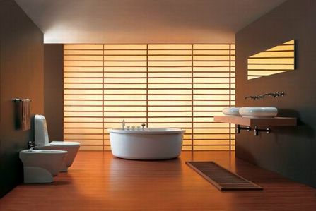 圓形的臺盆和浴缸給人以奢華的感覺,木質的踏板和移門設計,給人以濃重的懷舊感。
