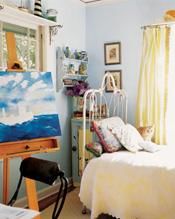 最適合于夏日午后時光流連的舒適小床,簡潔的鐵藝床頭富于美感,手感厚實暖和的白色床罩和窗簾,搭配淺藍(lán)色的墻壁和家具,氣氛寧靜。大小不同的靠墊有很好的裝飾效果。