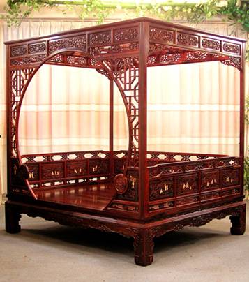 比如,中國的古老的大床,就是一種非常科學的產(chǎn)品。這種床統(tǒng)稱架子床??煞譃椤八闹病?,“六柱床”。其它變體形式較多,如月洞門罩架子床等。它三面有40公分高的圍欄,床口兩邊還有40公分寬的圍欄,只留1.2米左右門洞上落床。