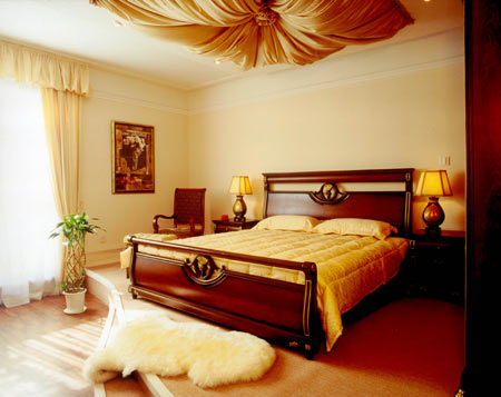 淺米色的天花,深米色的墻面,淺木本色家具,地面用更重一些的赭色地毯,織物和窗簾用米色,再配以少量的橄欖綠、土紅、淺褐或桔黃、白色的小陳列品,造成一種溫馨、清晰的色彩效果,更為適合一般臥室。